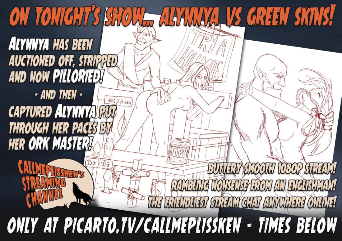 I’m sure you’ve had a long week so why not come join me and Ranger Squad tonight for 3 to 4 hours of completely free live drawing entertainment? First up is part 4 of the mini-story from this AHMT classic –AHMT #113 – Aly on the auction block and then we’re going rather lewd with Aly and her ork master gift picture!