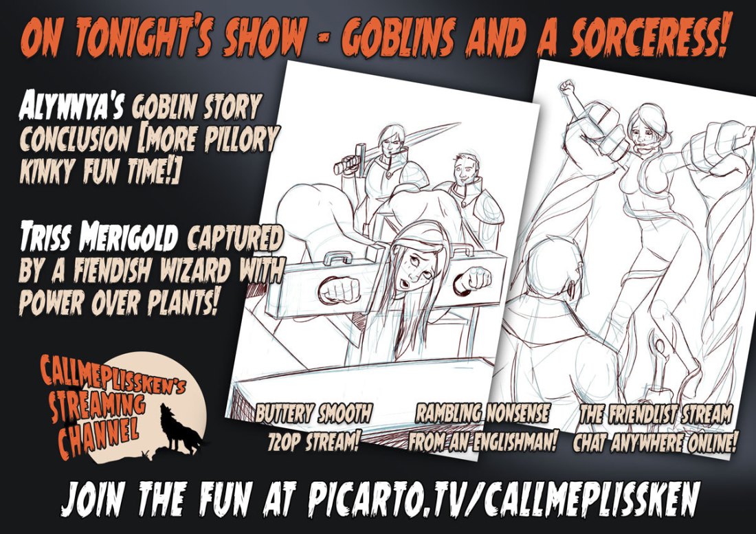 It’s Saturday night (here in the UK at least lol) and for those of you who aren’t out enjoying halloween parties, I’ll be streaming the finale of Aly’s goblin story and a kinky fun Triss Merigold pic!Come join me and Ranger Squad (our awesome steam regulars) for another night of chilling, chatting and entertainment at http://picarto.tv/callmeplissken –