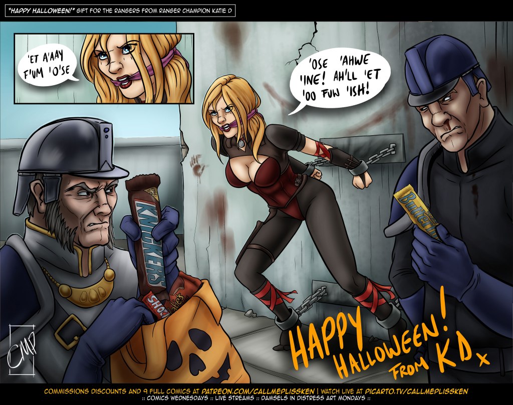 This one comes from a commission to a story where Evie’s in real danger, then the image was modified to show the bad guys stealing her Halloween Candy.