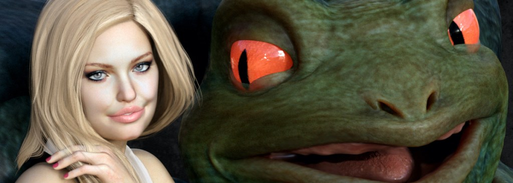 Her intention had been to get the space toad off guard and keep him distracted.  Unfortunately, he seemed to be having that effect upon her.  The alien creature grinned a proud and devious grin.  After all, he was the one who had planted the thought in her head to dress up as prey.