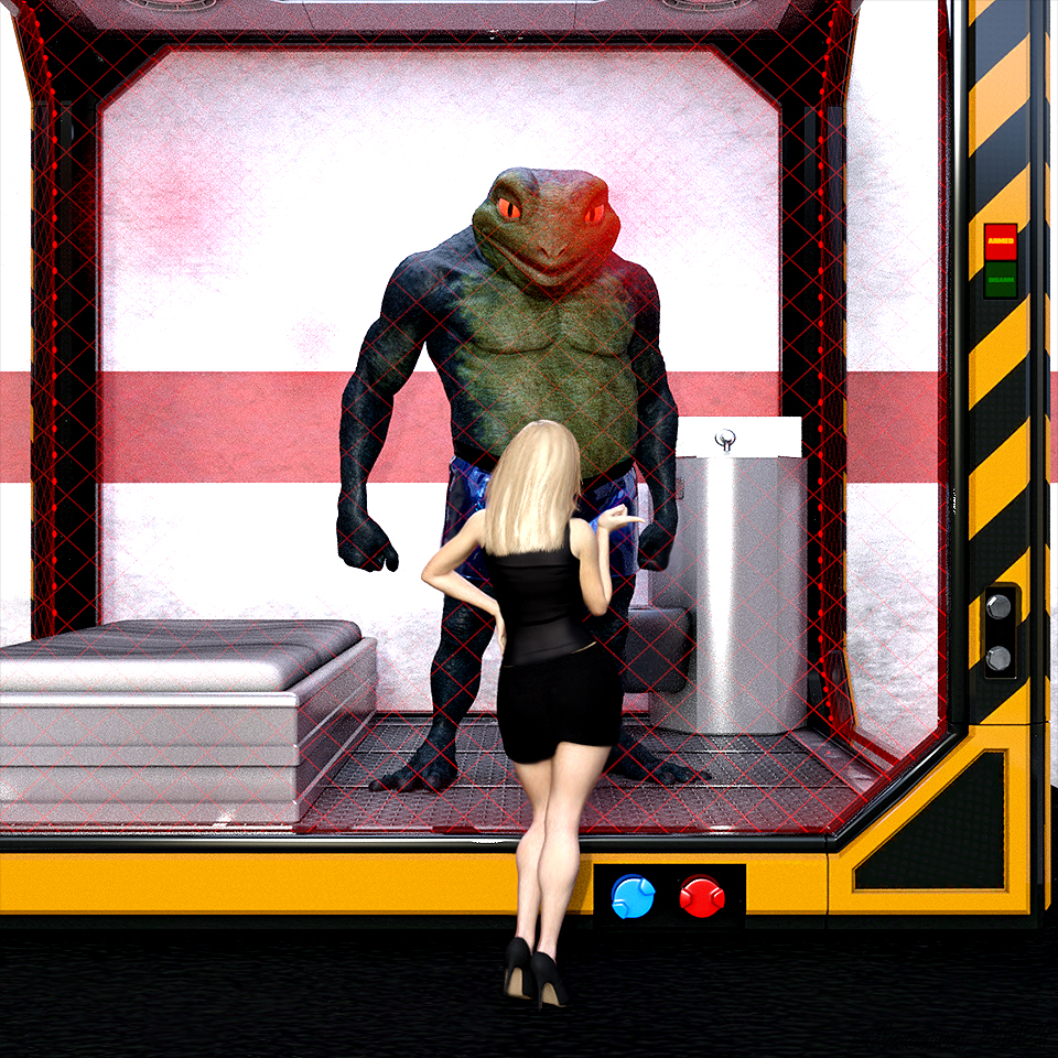 Agent Katie avoided the guards on duty and slipped quietly into the high-value-target room.  She tried to be quiet while approaching the containment cell holding the alien creature, but high heels on a tile floor don’t lend themselves to stealth very well.