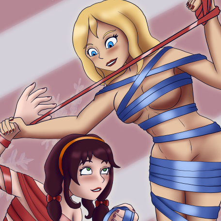 Evie giggled.  “No, like a gift-wrap battle.”  She held up two large rolls of ribbon, one blue and one red.  “We try to wrap each other up until one of us can’t continue.  Then the winner gets to do anything they want to the loser until they can escape.  Or…”  Evie nodded toward the strap-covered leather jacket.  “If they can’t escape, they submit to going into the Cinch-Jacket.”