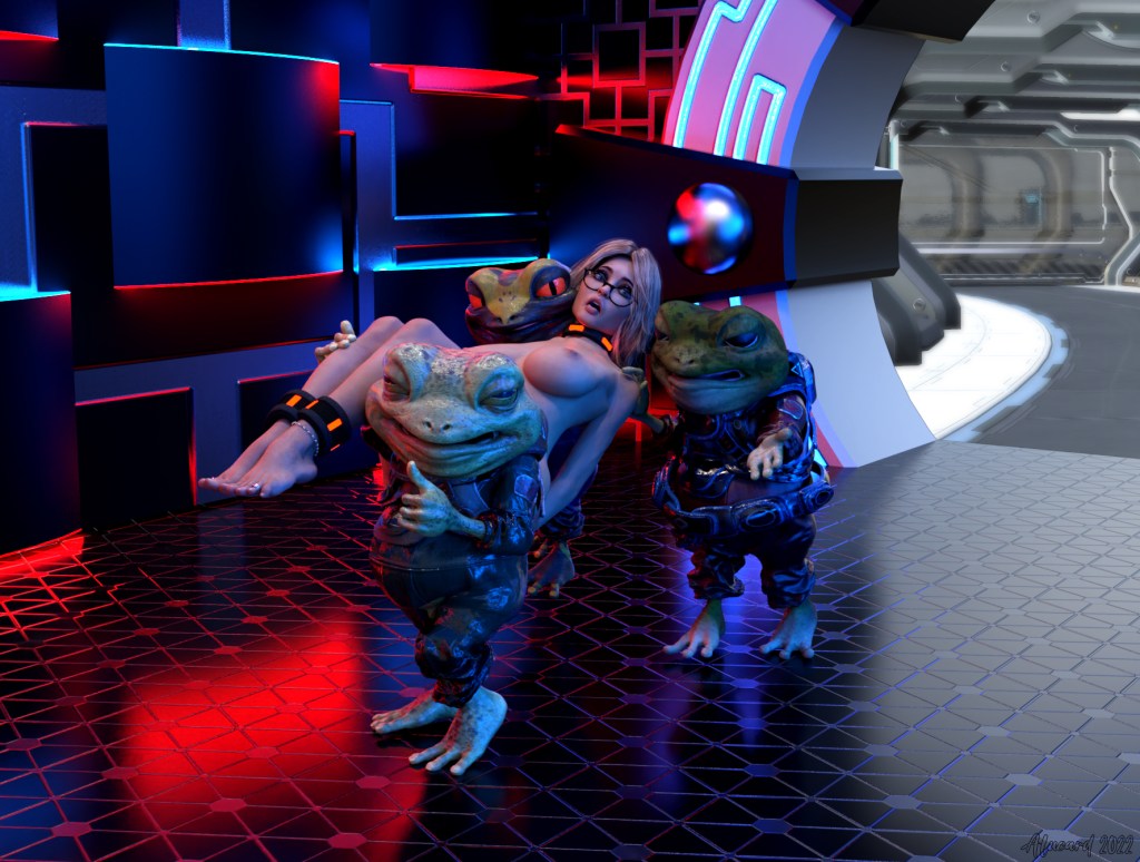 “We has you now, hooman agent girl,” said a voice behind me. I whirled to see a smaller yellow froglin in a dark space-suit who had hopped up on my bed.