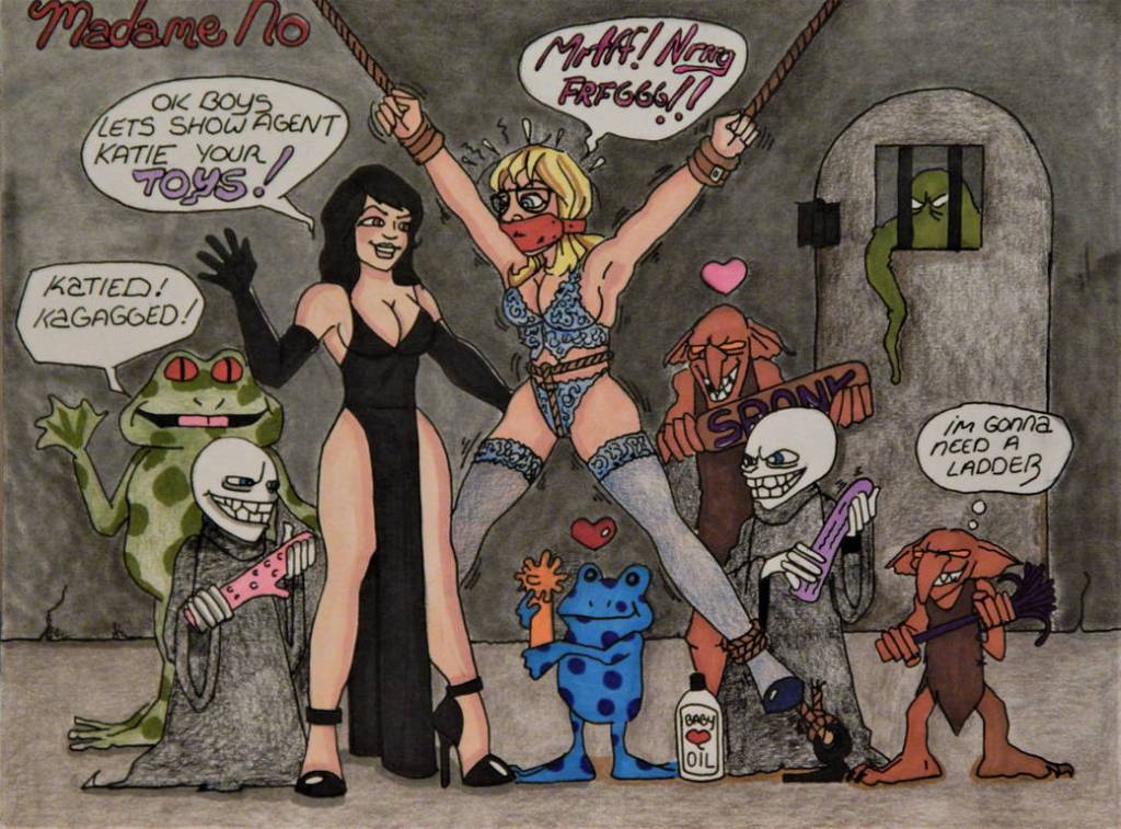 She knocked Agent Katie out with a tranquilizer dart – stripped her down to her panties – then gagged her and tied her up tightly with an elaborate harness.