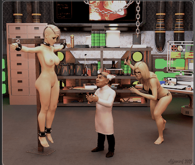 Grudgingly, Susan and I submitted to Countessa’s command and surrendered. I hung my head in humiliation as we were lifted from the slime pit, and we were once again restrained by the catsuited agents of I-PRUDE.