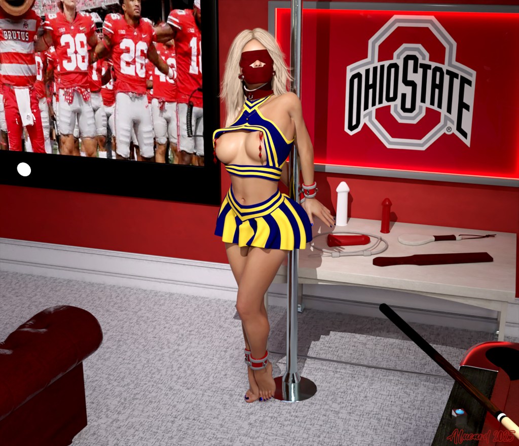Michigan Cheer captive cutie Katie is attending an OSU Championship Game watch party…as a party favor…