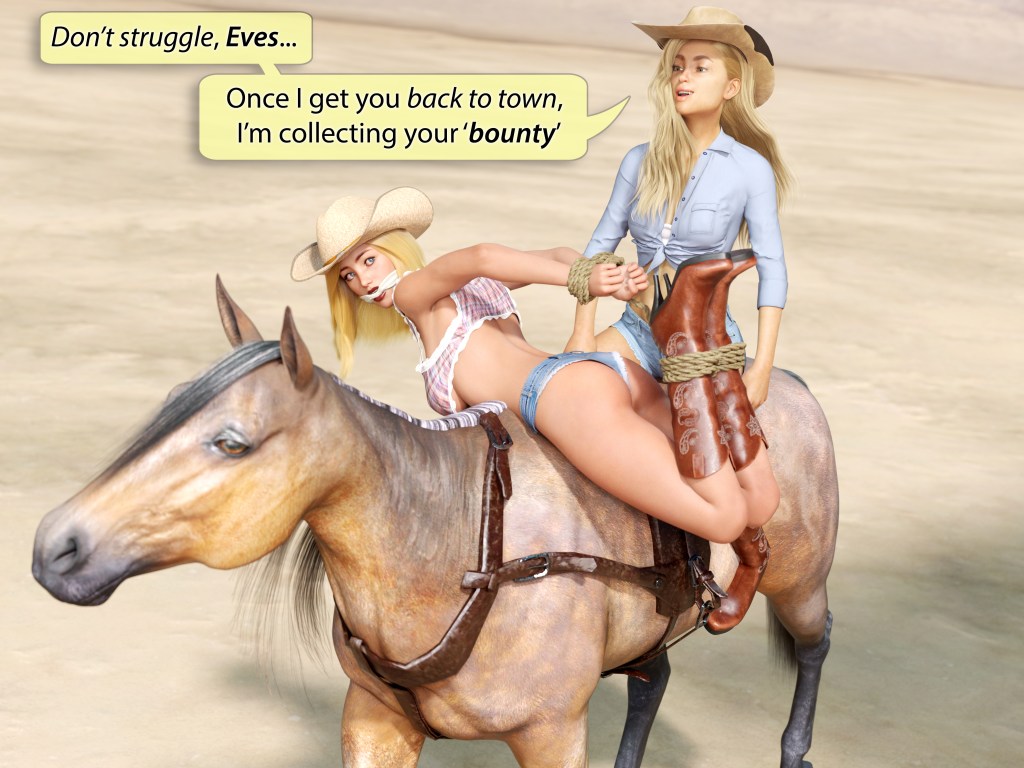Gosh, one hopes nothing happens to two beautiful Cowgirls all alone out in the desolate wastelands…especially when one is already bound and unable to fight back…