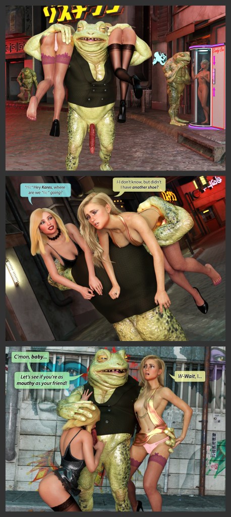 Kara and Evie are having a great decadent weekend in Frog City – but are led astray by a deviant FrogMan.