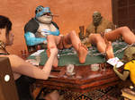The snotling looked up, startled and a little intimidated. He’d been holding his cards low in his lap and suddenly stuck something in his trouser pocket. “I gots no tribe thanks to ‘at one,” he muttered, waving his hand at the girls. “New tribe only let me in if I bribe with gifts. Dem humies is my gift to new tribe.” He sneered at the chained captives. “An’ if dat don’ work, I’ll just breed ‘em to make my own tribe.”’